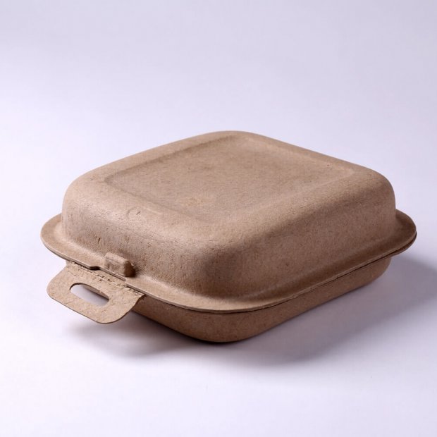 Recycled corrugated paper pulp molded hinged packaging box.